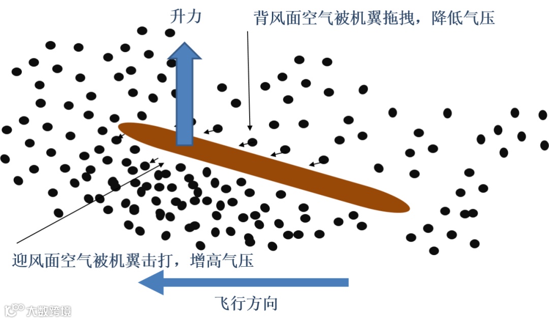 飞行时,迎面而来的空气被机翼下表面击打,在下表面增高压力,机翼上表面背风前进时,由于正在拖动空气,于是在上表面降低了气流压力。因此,机翼下表面感知气流更高的压力,机翼上表面感知气流更低的压力,如同有举重机从下方举机翼,有起重机从上方吊机翼,于是就产生了让飞机飞起来的升力。