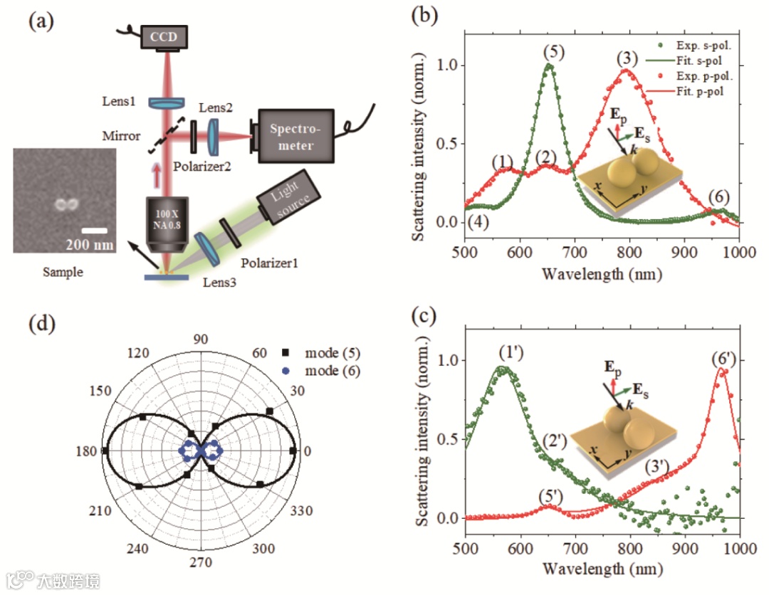 图2 金纳米球DoFN光学响应的偏振分解暗场散射实验研究。(a)实验装置示意图及对应DoFN结构扫描电镜图(SEM)。(b)平面波入射方向垂直于二聚体长轴时的实验测量偏振分解散射谱,其中点数据为实测数据,实线为相应的拟合谱线。(c)平面波入射方向接近平行于二聚体长轴时的实验测量偏振分解散射谱。(d)极坐标下模式(5)和(6)散射强度的探测偏振依赖分布图样。