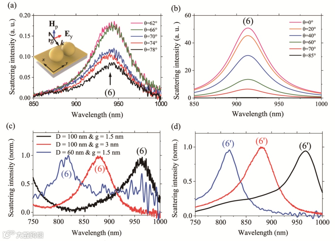 图3 金纳米球DoFN结构中磁共振模式光学响应的调控。(a)实验测量和(b)数值计算得到的不同入射角θ激发时磁共振模式(6)的散射谱。(c)具有不同金纳米球直径或颗粒-薄膜间隙尺寸的样品在磁共振模式(6)的散射谱。(d)与(c)结果类似,但为混合模式(6')的散射谱。