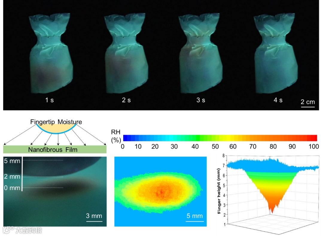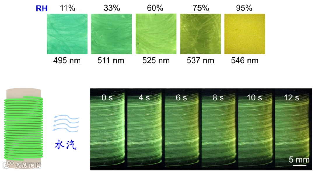 在RH11%-95%的相对湿度范围内,AIE/聚合物纤维发生可逆变色,颜色与相对湿度数值呈线性响应,可对宏观环境的湿度进行定量可视化检测。这种荧光响应性能可以通过细化纤维结构和调节聚合物的化学结构而得到放大,从而使水分子能够迅速地在纤维中扩散,实现超快速(< 1 s)的智能感应。