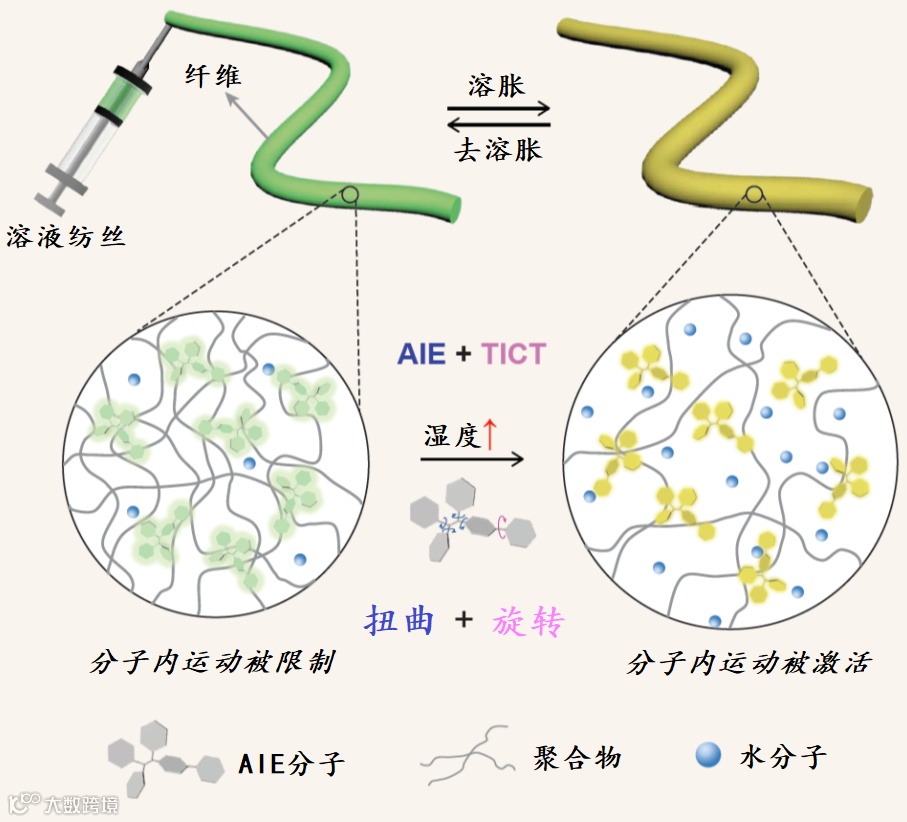 研究者使用大规模溶液纺丝工艺,以D-A(供体-受体)AIE荧光分子为发光单元,商用亲水性高分子为捕水型网络,连续制备了AIE/聚合物纤维(微/纳米)。