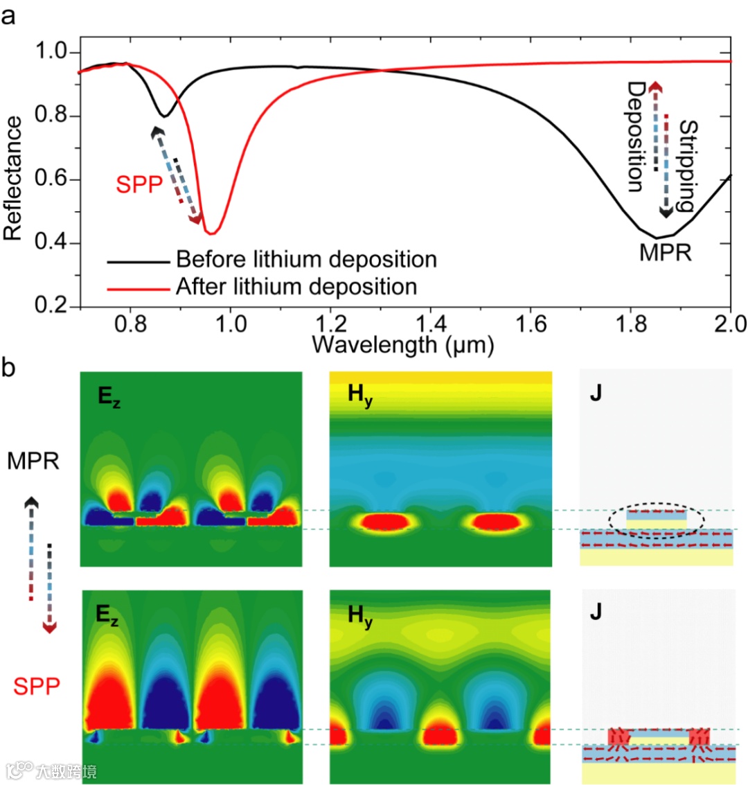 图二:模拟计算反射光谱和场分布: (a)锂沉积前/后的计算反射光谱,(b)模式计算的电场Ez,磁场Hy和电流密度J场分布:磁等离激元共振(上半部)和表面等离激元共振(下半部)。