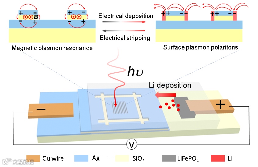 南京大学周林/朱嘉研究团队,结合了锂金属作为高效的光学信息载体和高性能能源存储载体的两方面特性,实现了第一个基于平面锂金属电池的动态电场调控手段,完成磁等离激元共振和表面等离激元共振之间的动态调控。