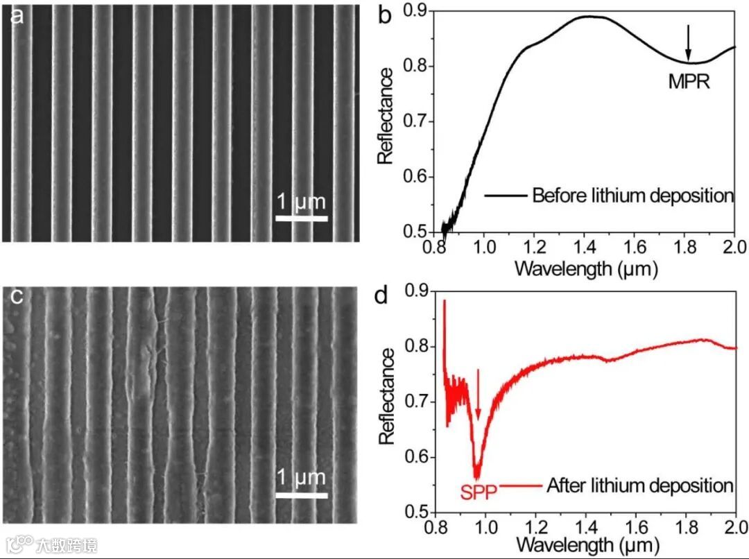 研究人员选择银基金属-介质-金属(Ag-SO2-Ag)三明治栅状结构作为产生磁等离激元共振的微纳结构单元。以此结构作为一侧电极,以含锂正极材料为另一侧电极,组装平面结构锂金属电池(图1)。在含锂离子的有机电解液中,施加合适电流后,锂可选择性地在金属-绝缘体-金属三明治栅状结构的侧壁垂直沉积生长,当金属锂连接上层金属和下层金属衬底后,使得不连续的金属-介质-金属结构变为连续的单界面金属光栅结构,局部磁场激发(磁等离激元共振MPR,1.85um反射谷)切换为非局域电场激发(表面等离激元共振SPP,1um反射谷)。