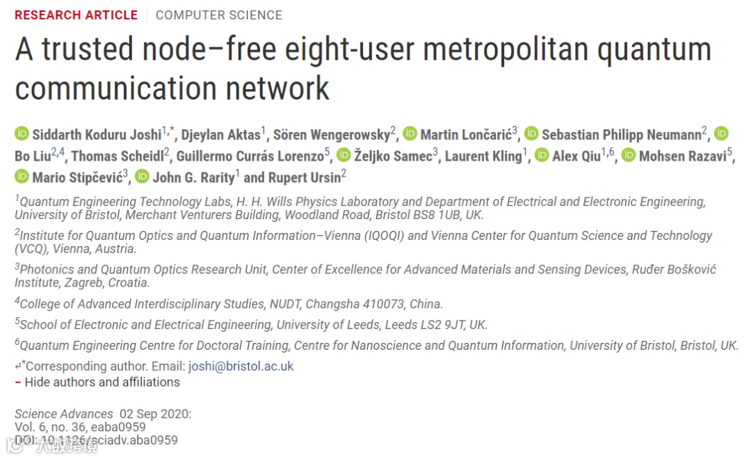近日,英国、奥地利、克罗地亚和中国的科研团队提出了一种城域范围内无可信中继的新型量子纠缠分发网络,并在实验中得以实现。这一新型架构有望拓展为更大规模的量子通信网络。相关研究成果发表于9月2日出版的Science Advance, DOI: 10.1126/sciadv.aba0959。