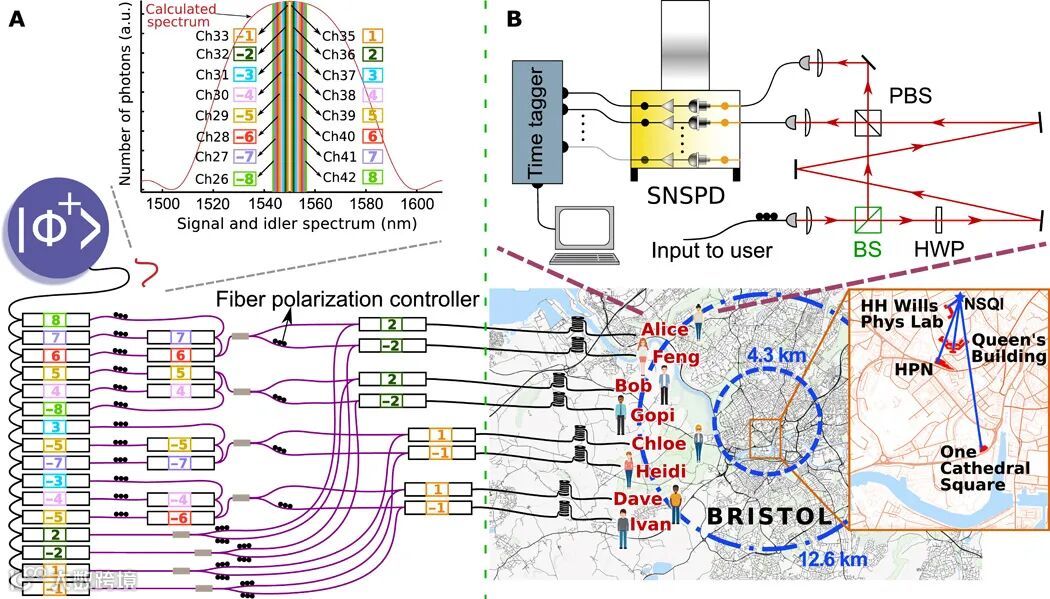 图2 波分复用和多路分解的示意图和实验中布里斯托尔市的用户分布及节点的测量设备。(来源:advances.sciencemag.org/)