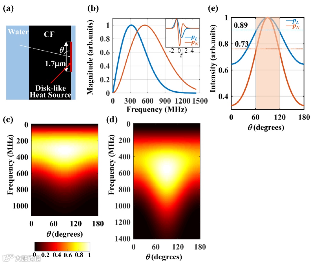 (a) 薄圆盘状热源的横截面示意图。(b) 点源产生的双极波(蓝色曲线)和三极波(棕色曲线)的归一化频谱,插图是相应的波形。由双极波(c)和三极波(d)贡献的薄圆盘状热源产生的光声波的归一化谱与角θ的关系。(e) 二维圆盘光声源的指向性。角度如(a)所示。