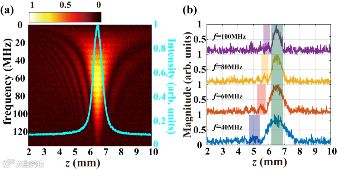 用PA法测量了93 MHz聚焦超声换能器沿z轴的声场。(a) 归一化声强与z轴曲线(青色实线)和SIR沿z轴的频谱(热彩色图)。(b) 频率f=40、60、80和100 MHz时沿z轴的固定频率声波的归一化声压幅度。