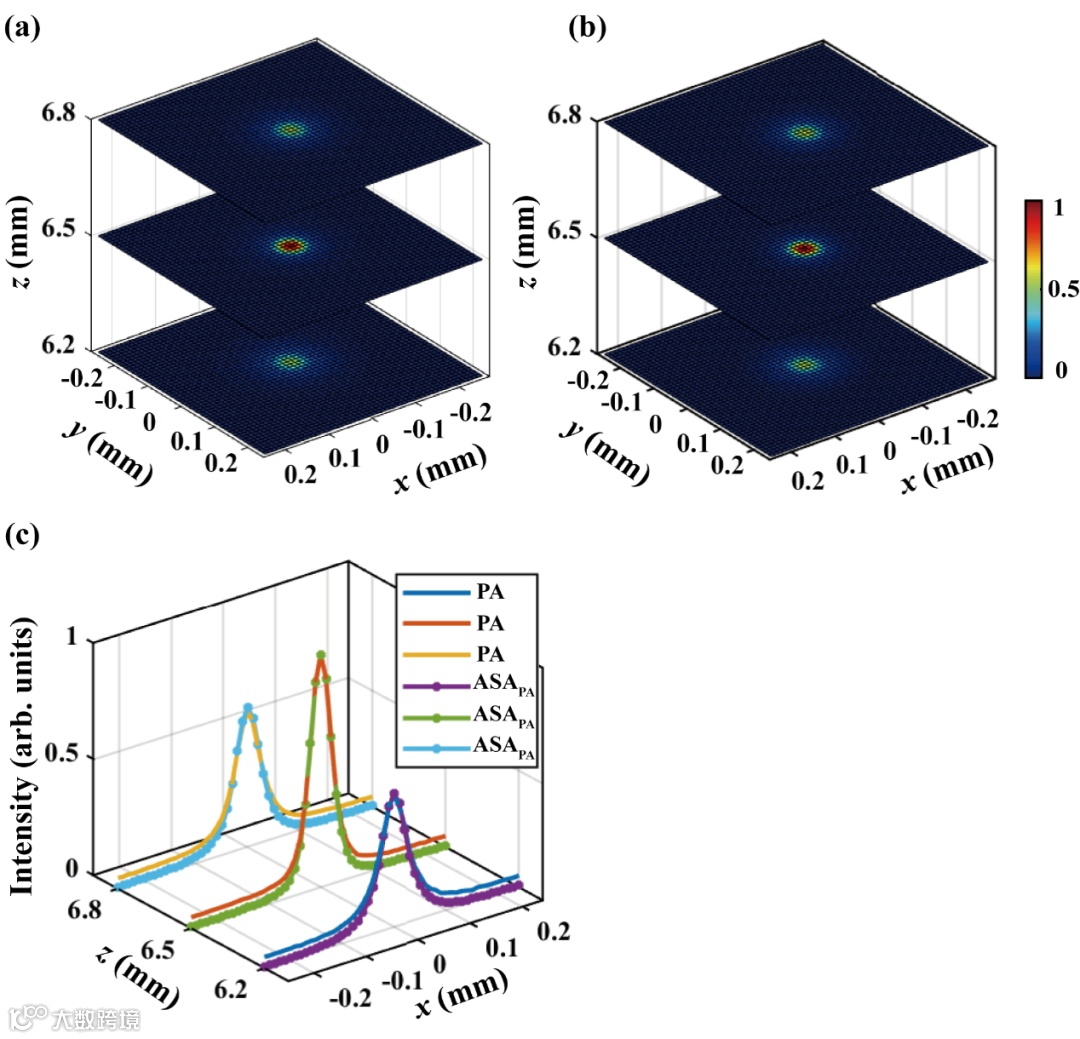 z=6.2 mm、6.5 mm和6.8 mm时,93 MHz聚焦超声换能器在xy平面上的声强分布。结果(a)用PA法测量出来的,(b)测量z=2 mm的xy平面上的SIR分布后,用角谱法重构出来的声场分布。 (c) y=0时沿x轴的声强分布。ASA结果根据在z=2 mm (使用PA法)进行计算。