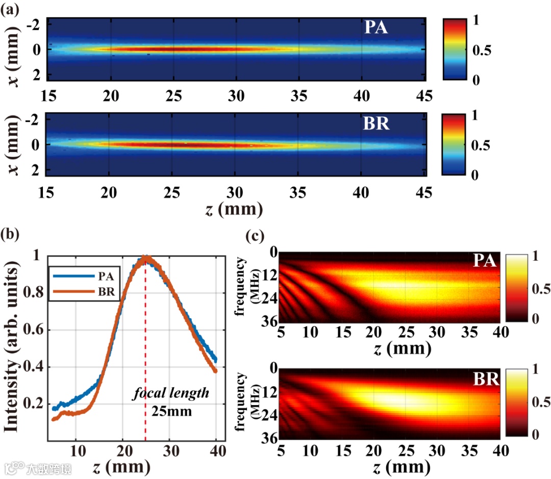 20 MHz聚焦超声换能器的声场测量。(a) 用光声(PA)法(上图)和小球反射法(BR)在y=0时在xz平面上测量的归一化声强度。(b) 用PA法(蓝色曲线)和BR法(棕色曲线)测量的沿z轴的归一化声强。传感器的焦距约为25毫米。(c) SIR沿z轴的频谱。