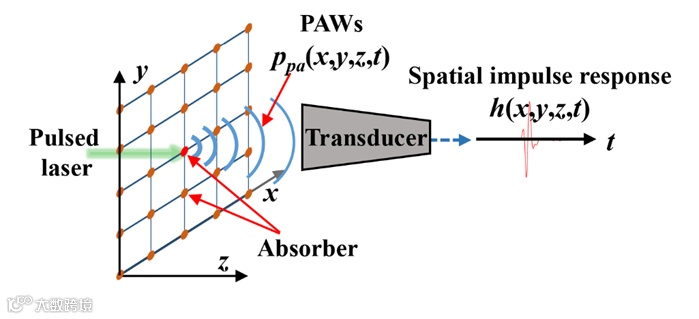 光声法示意图。换能器对脉冲光声波(PAWs)的响应与其空间脉冲响应h(x,y,z,t) 相对应。