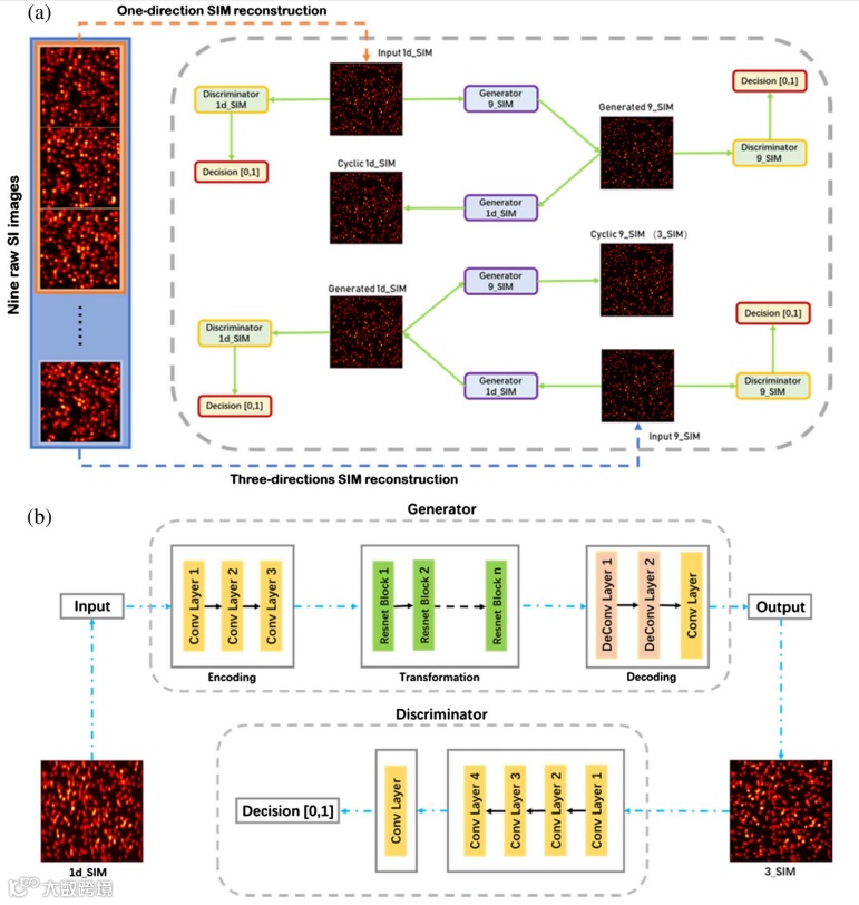 荧光显微镜是观察细胞、组织和生物体的重要工具。然而,阿贝衍射极限意味着荧光显微镜的空间分辨率只能达到入射光波长的一半。最近发展起来的显微技术,如STORM、PALM、结构照明显微镜(SIM)、STED等可以帮助克服这一限制,使生物过程的成像成为可能更高分辨率的细胞。SIM由于其光毒性低、帧速率高,在生物成像中获得光学超分辨率的优势尤为突出。为了从原始数据中计算未知频率,SIM需要三幅具有移动照明模式的图像来分离沿给定方向的混合空间频率。为了提高各向同性分辨率,该过程进行了三次,使用不同角度获得的照明图案,并且每个超分辨率(SR)SIM图像总共需要九个原始图像,这意味着样品需要反复曝光。因此,在SIM重建中减少原始图像的数量是近年来研究的热点。深度学习(DL)框架不显式地使用任何模型或先验知识,而是依赖于大型数据集来“学习”底层的反问题。卷积神经网络(CNNs)属于深度学习的范畴,可以在图像处理和计算机视觉任务中获得优异的结果。其结果有两个重要组成部分:首先,训练阶段的结果是一个CNN,它对应于一个合理的潜在映射函数,该映射函数将度量与解决方案相关联;第二,训练过的CNN可以用来进行“预测”。