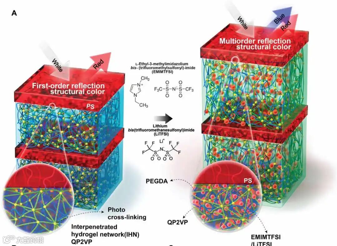 最近,来自韩国延世大学(Yonsei University),韩国高丽大学(Korea University)和美国赖斯大学(Rice University)等机构的研究人员使用自组装1D嵌段共聚物(BCP)的光子晶体(PCs)中产生结构色(SCs)。其层状的一维周期性微观结构在成膜后自发形成。可以通过多种不同的外力和环境力来调节各层的介电常数,从而获得一种三维无接触交互式显示技术。为了确保固态全可见光SC-BCP-PC,研究人员在BCP-PC之间填充一种自己开发的化学交联互穿水凝胶网络(IHN)层。此外,当非挥发性离子液体随后被吸收到互穿网络的畴中时,BCP-SC不仅受到一阶光子反射的控制,而且还受到二阶和三阶光子反射的控制,从而产生更丰富的可见光SCs。此外,研究人员通过使用离子液体作为喷墨打印墨水,可以立即产生各种全SC显示图像。因此,使用吸湿性离子液体墨水实现了可打印的3D触摸交互式显示器,该墨水允许随湿度变化而变化的SC。该技术展示了对人体手指发出的水蒸气的三维位置感测,实现非接触的三维交互感知。该工作以”3D touchless multiorder reflection structural color sensing display”为题发表在《Science Advances》上。(鲁强兵)