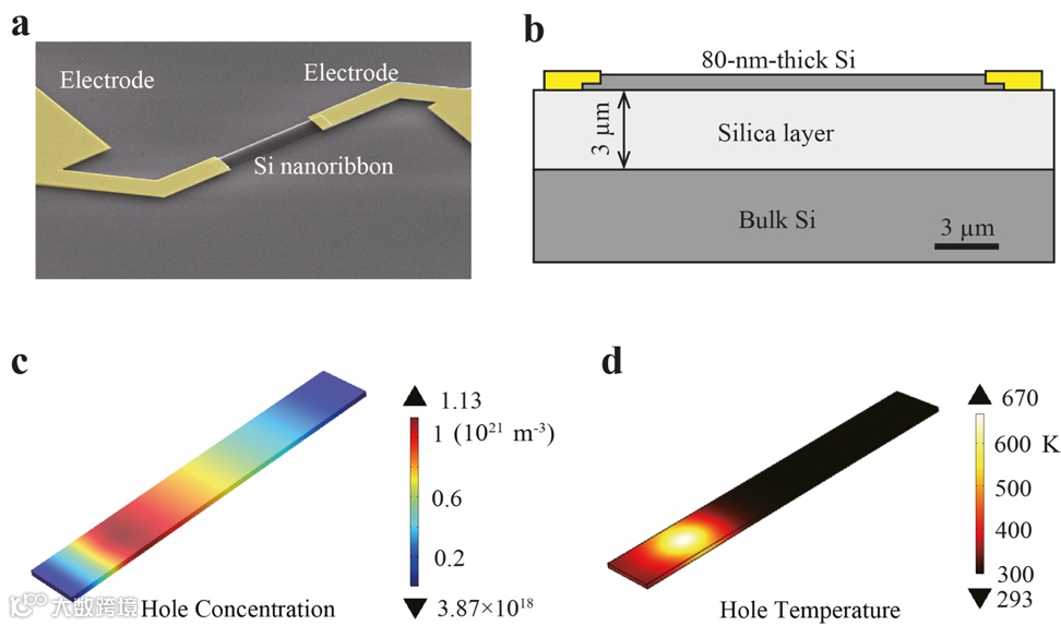 本工作引入了“载流子-晶格”双温度模型,从光生载流子粒子数动态平衡、热传导平衡和电荷输运平衡三个方面建立方程,实现对载流子稳态分布和输运问题的迭代求解。详细模型见文章补充材料。多物理模型计算结果证实了硅纳米带中的载流子温度梯度稳态分布,如图1d所示。
