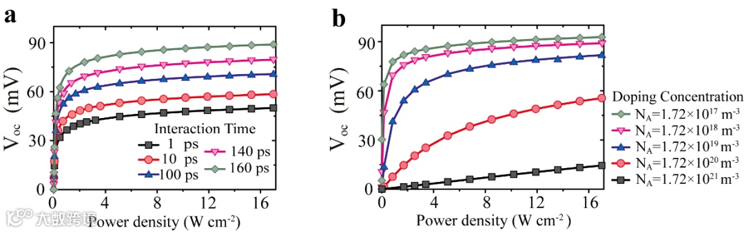 模型结果还显示,硅纳米材料中的受限声子散射和掺杂浓度,对于载流子温差值和光热电效应的光电响应(如开路电压)有重要影响,如图4所示。通过与实测开路电压对激光功率密度的依赖曲线进行比对,确定了模型中硅纳米带中载流子-晶格相互作用时间参数为160 ps。