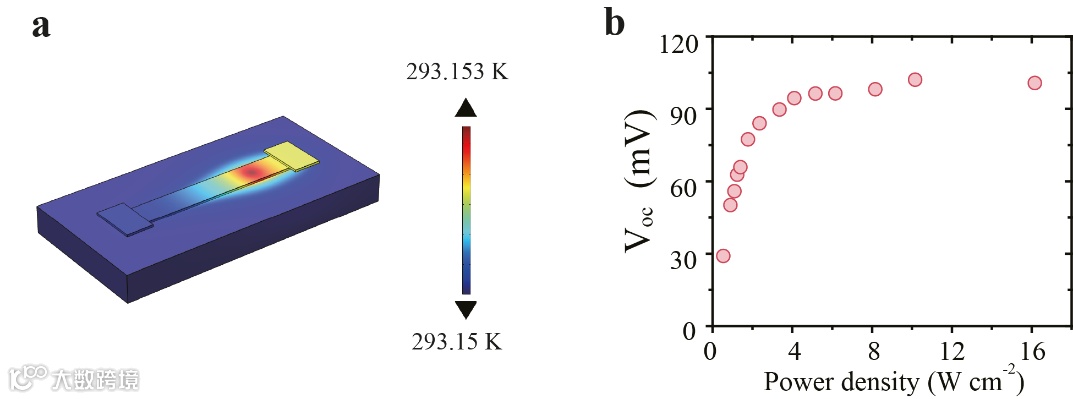 实验中发现光热电效应导致的开路电压或短路电流随激光功率增大会出现饱和行为,见图3b。通过COMSOL 建立了光-热-电多物理模型仿真显示,饱和行为是由载流子温度随激光功率密度的增加而饱和导致的。