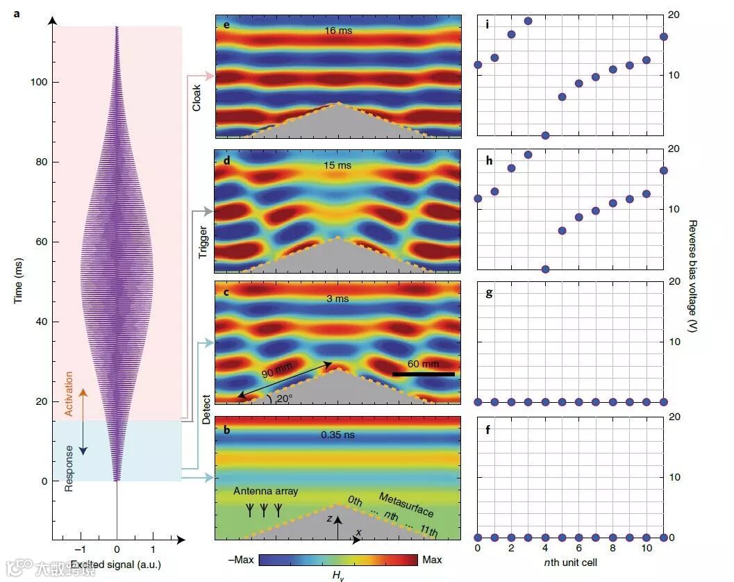 在仿真中,具有随机余弦调制高斯波形的TM平面波入射在斗篷上。上图绘制了不同时间的波形和物理图像。在初始状态下,所有偏置电压均设置为零。随着时间的流逝,入射波与凸块相互作用,使散射波强烈扭曲,如图c所示。在约15 ms(实际响应时间)之后,检测器接收入射波信息,并将其馈送到预训练的ANN。后表面的披风被触发(图d)并使凸块不可见(图e)