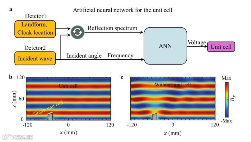 当入射波或背景发生变化时,这种超表面披风可能会变得效率低下,甚至无法使用。本项研究中的隐身斗篷将实时检测影响隐身的因素,并转换为必须的局部反射光谱,作为人工神经网络(ANN)的一个输入信息。同时,由于超表面的强频率色散和非局部效应,将检测到的入射波设置为另一个输入,该入射波的特征在于其入射角,频率和极化。通过深度学习,将其关系概括为{入射波和反射光谱}→{偏置电压}。