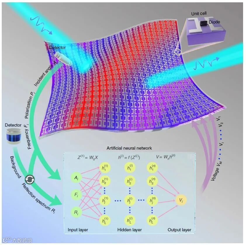 该隐身斗篷包括五个主要部分:可调的可重构超表面外壳,两个检测器(用于入射波和周围背景的探测),经过训练的人工神经网络和一个电源平台。