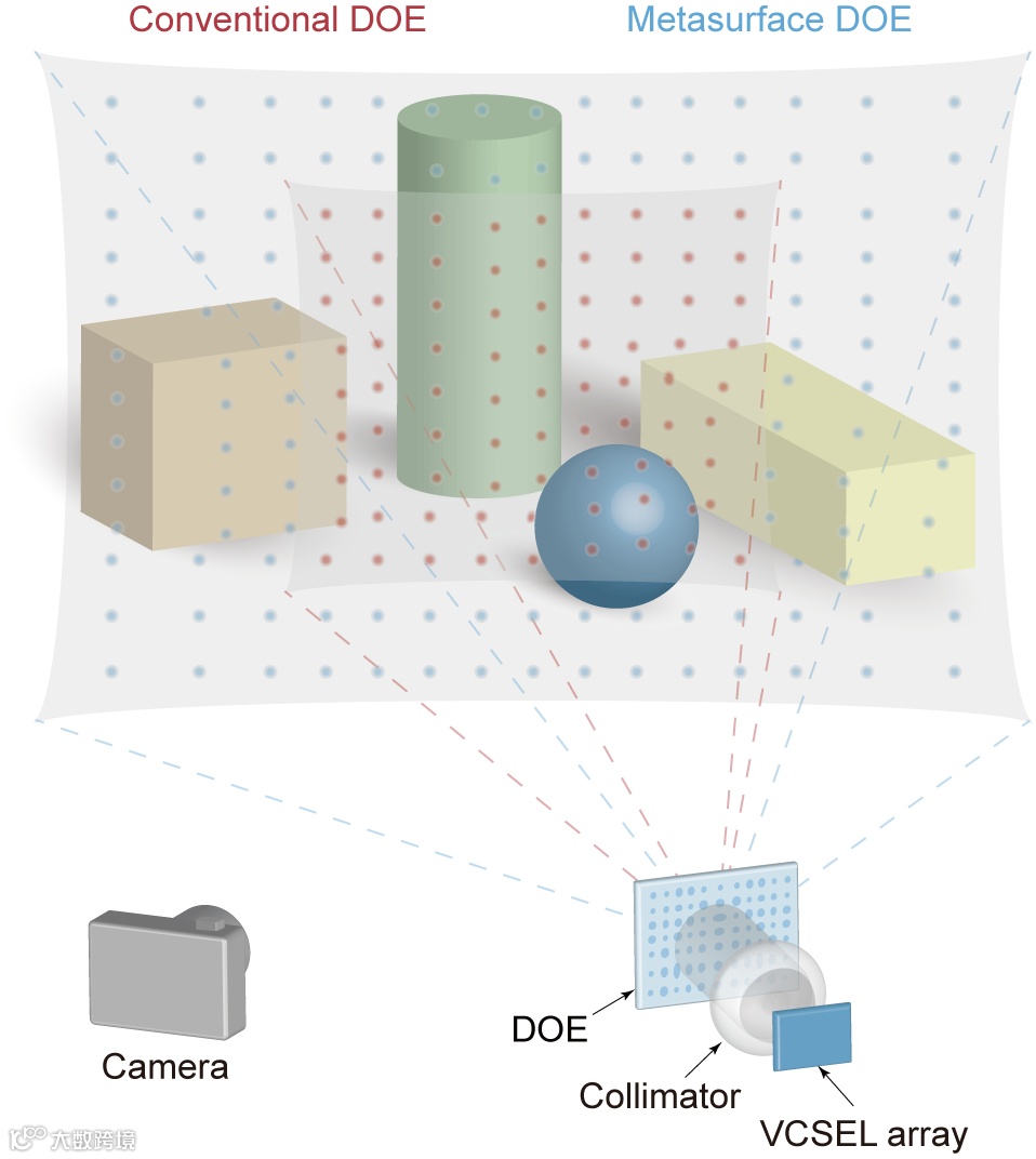 图1. 典型的基于结构光深度感知系统示意图。红点和蓝点分别表示通过传统DOE和超构表面DOE投射出的结构光图案。