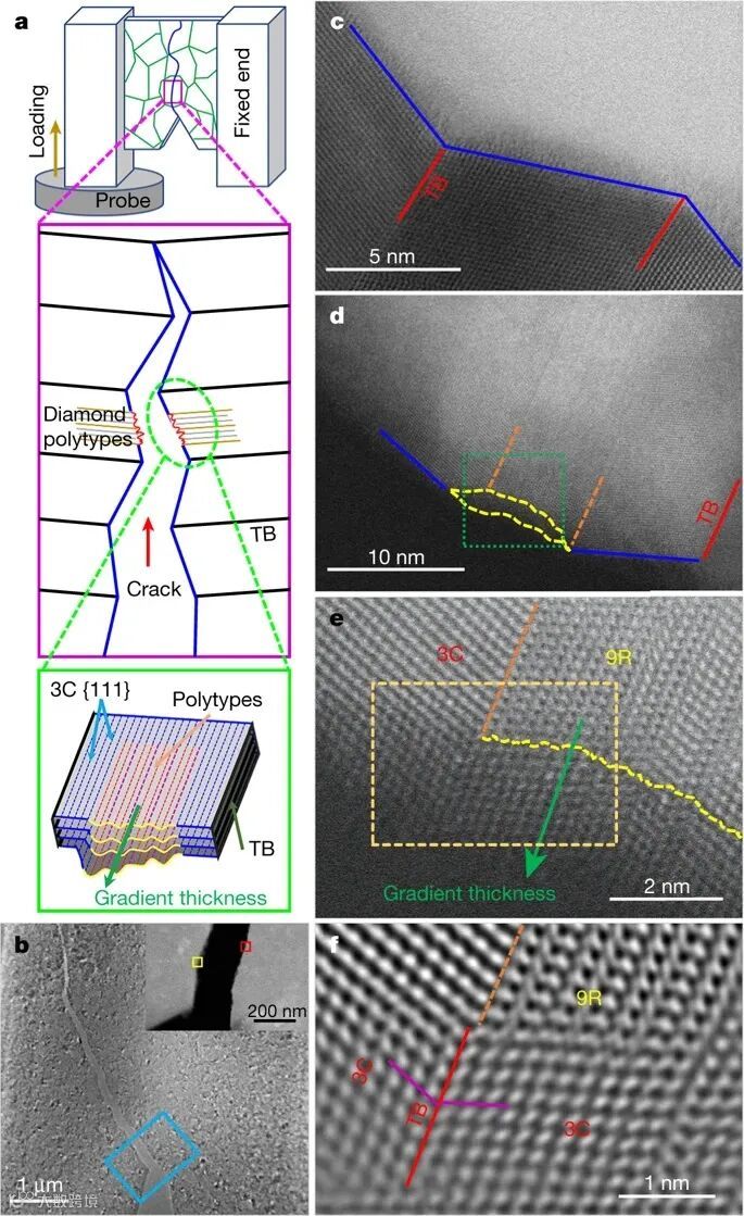 有鉴于此,燕山大学田永君、北京航空航天大学郭林、燕山大学周向锋等报告了金刚石复合材料的结构表征,这些金刚石复合材料由相干的界面金刚石多型体(不同的堆积顺序),交织的纳米孪晶和互锁的纳米晶粒组成。复合材料的结构比单独使用纳米孪晶更能提高韧性,而不会牺牲硬度。单边凹口光束测试的韧性是合成金刚石的5倍,甚至比镁合金还要大。当发生断裂时,裂纹通过之字形路径沿着{111}平面传播通过3C(立方)多型的金刚石纳米孪晶。当裂纹遇到非3C型的区域时,裂纹的传播会扩散成弯曲的裂缝,并在裂缝表面附近局部转变为3C金刚石。这两个过程都会耗散应变能,从而提高韧性。这项工作可能对制造超硬材料和工程陶瓷有用。通过使用具有硬化和增韧协同作用的结构体系,最终可以克服硬度和韧性之间的折衷。