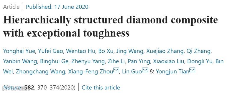 相关结果以Hierarchically structured diamond composite with exceptional toughness为题于2020年6月17日发表在Nature期刊上。