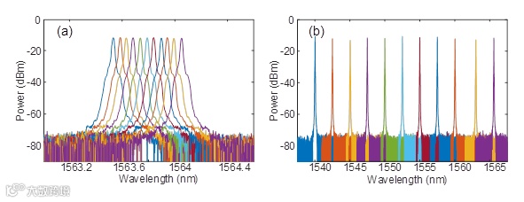 在腔长为41米的环形腔激光器中,对应的FSR为4.88MHz。TOF的带宽为0.1纳米,其中大约包含有超过两千个纵模。再利用PT对称的选模机制从这些纵模中选出增益最大的一个模式,从而实现稳定的单模激光输出。利用TOF的可调谐性,可以实现输出激光的波长调谐。图3展示了该激光器的最小调谐步长和最大调谐范围。