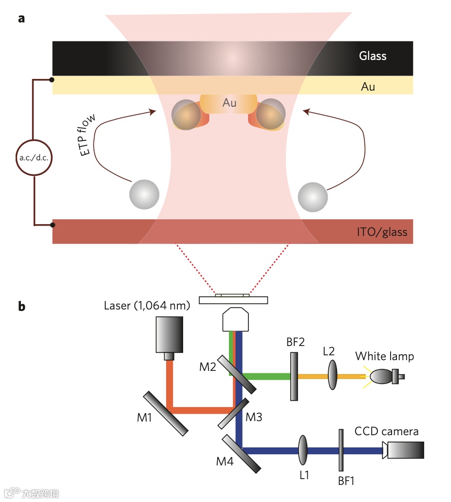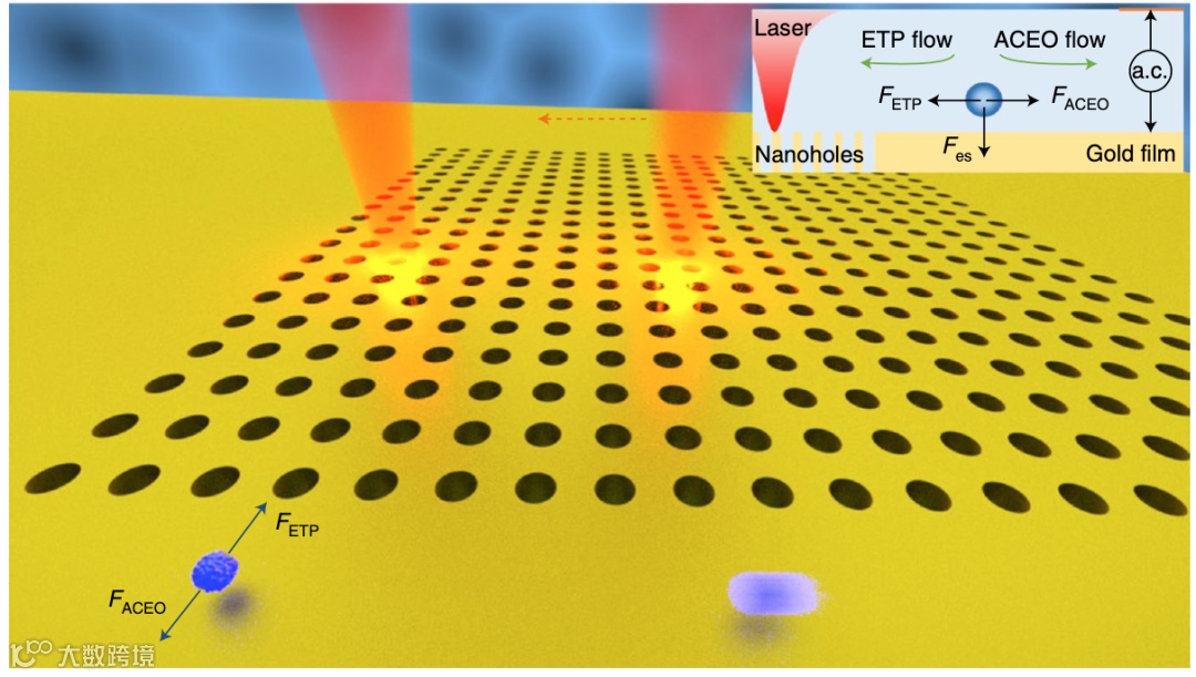 光-热-电动流体纳米镊子包含了一个有限的等离子纳米孔阵列,这些纳米孔被光照射并垂直施加了交流电,从而建立了电热等离子流和交流电致电渗流的相互作用。
