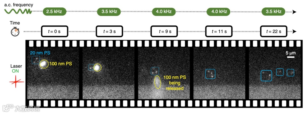 研究人员利用含蛋白质和聚苯乙烯珠(20nm和100nm)的稀释溶液进行了实验。通过交流电的开关实现了单个蛋白质分子的运输、捕获和释放,并且利用激光束的运动展示了单个分子跟随激光运动的动态操纵过程。同时,控制交流电频率还可以实现对粒子俘获位置的操纵,并应用于物体的大小分选。如图5中,100 nm的聚苯乙烯珠变得不稳定并被分选出来,而20 nm的磁珠仍然处于俘获状态。