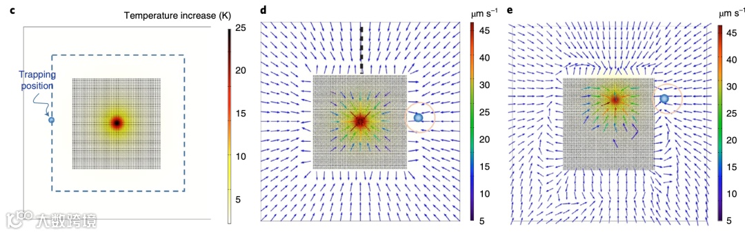 这两个相反的涡流会在合速度为零处形成一个停滞区,即是粒子被捕获的位置。停滞区的位置距离激光焦点的位置较远(几微米),避免了激光束直接照射可能出现的损伤。如果激光束偏离纳米孔阵列中心,粒子可以沿着纳米孔阵列的外围路径平移,同时仍保持停滞区的位置。