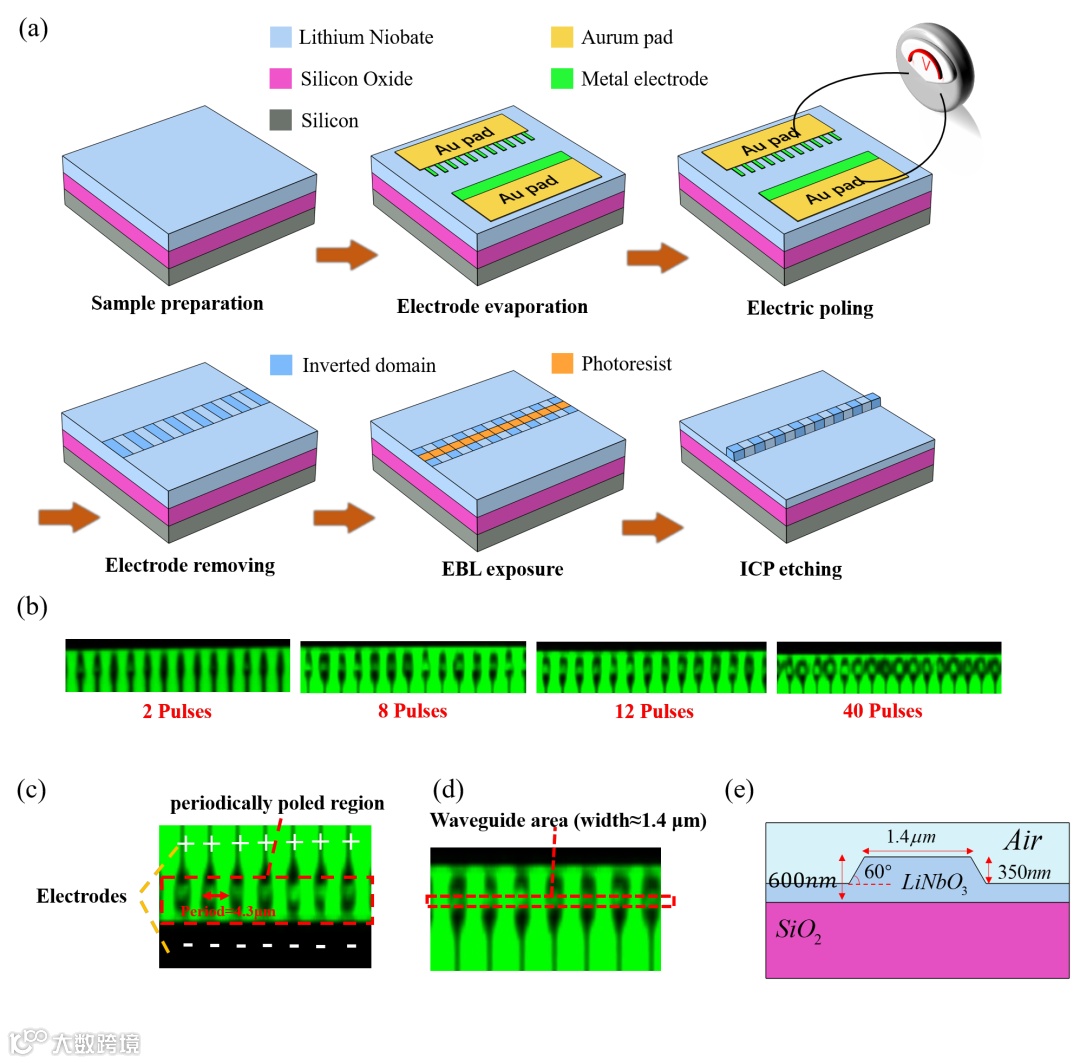 图1 (a)工艺流程示意图;(b)反转铁电畴横向生长随着高压脉冲个数的演化图;(c)使用倍频共聚焦显微术观测的铁电畴反转区域放大图;(d)脊型波导选取在占空比接近50:50的区域(红色虚线框内);(e)铌酸锂薄膜脊型波导的截面示意图。