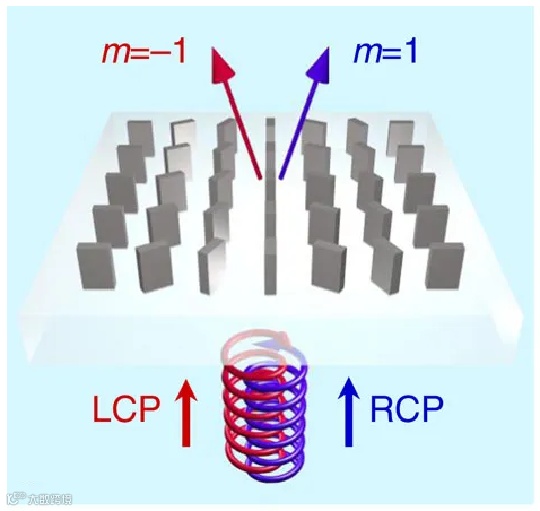偏振分束器可以将一束入射光分成两束正交的偏振光,可以应用于光纤通信和偏振成像等领域。束元件由于体积大,阻碍了它在集成光学系统中的应用,介质超构表面可以实现偏振敏感的相位梯度,将偏振与相位同时调控,对不同偏振的光施加不同的相移,从而偏转不同的角度。利用几何相位手性共轭的特点,很容易将光的左圆偏振和右圆偏振分量分开,如图(3)所示,通过合理地设计纳米结构的角度,利用几何相位手性共轭从而将入射光束分解成两个正交圆偏振光束。