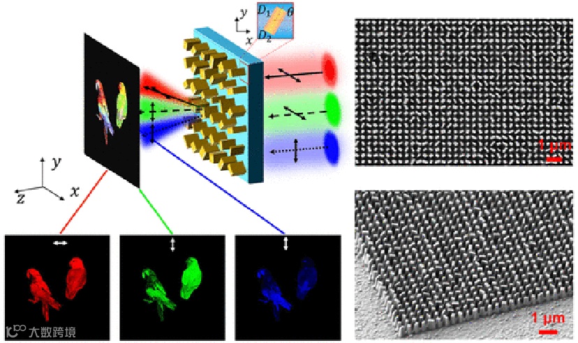 纳米印刷是近年来一项基于纳米结构的振幅调控的新兴技术。可实现超高分辨率化学稳定的图像显示,包括单色显示和彩色显示。然而,纳米印刷通常是基于纳米结构的共振来实现波长选择性和彩色图像的显示。偏振和振幅的同时调控为纳米印刷设计提供了一种新的方式。图(10)显示了一种高保真灰度图像显示方法,通过优化双折射单元尺寸,将结构设计成反射模式下的偏振器,在两个方向上形成不同的反射率,再结合马吕斯定律,通过合理地设计结构旋转角,从而控制每个像素的振幅,实现高清晰度的连续灰度图像。