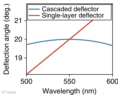 他们针对550nm波长的光波进行设计,其效果如图2所示。图中,蓝线和红线所分别表示的是双层串联超表面和单层超表面光学偏转器控制色散的结果。由此可见,所设计的双层超表面结构有着良好的控制色散的效果,并且这个效果优于单层的超表面结构。