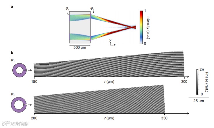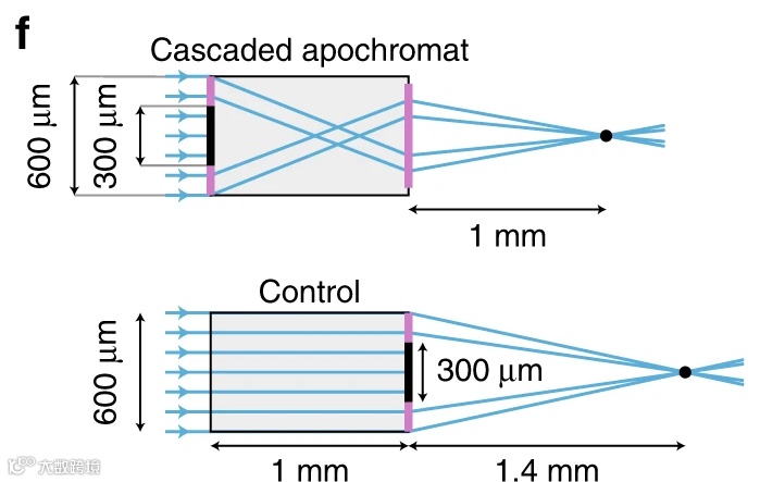 如图4所示,距离光轴最远的射线进入这个系统后偏转角度最大,从而获得了最长的OGL,同时这条光线从最靠近光轴的地方出来,在形成图像的空间中获得最短的OGL。相反,进入系统中最靠近光轴的光线偏转最小,离开系统时最靠近光轴的光线偏转最大,它在基片内获得最短的OGL,而在基片外获得最长的OGL。这样就使得两束光线很好地获得了相同的总OGL,也就满足了消除轴向聚焦光束的色散的条件。进一步,作者设计了高度消除色散的串联透镜,如图5上图所示。并且作者用仿真实验证明了光学扭转形透镜及高度消除色散透镜具有良好的效果,它们分别优于单层的超表面透镜即控制型透镜(控制型透镜示意图如图5下图所示)。