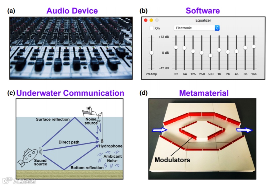 均衡,也就是调整宽带信号的频率响应,是信号处理中的重要概念。它已经广泛地应用于电信和各种声学应用,包括音频设备,室内声学和水下通信。所得的滤波器设备称为均衡器(EQ)。声音均衡器设备可以调整宽带声音信号的响度曲线,以改善音频的质量,因为声音的音色受不同频率成分的影响。在室内声学中,不同的复杂声学环境将影响频率响应的均匀性,因此声学均衡可用于再现声音信号或实现主动噪声控制。类似地,在水声声学中,复杂的环境使得水下声通信中必须进行声音均衡处理,另一方面,在过去的十年中,人们对声学超材料进行了积极的研究,为各种声学设备提供了不同的设计策略。例如,已经提出了声学超材料来主动控制特定有趣的声学现象,例如鸡尾酒效应,声学混响和声学全息图。声学超材料也用于水下通信。为了进一步减小声学共振单元的厚度,人们提出了声学超表面的概念来设计非常规的超薄声学装置。