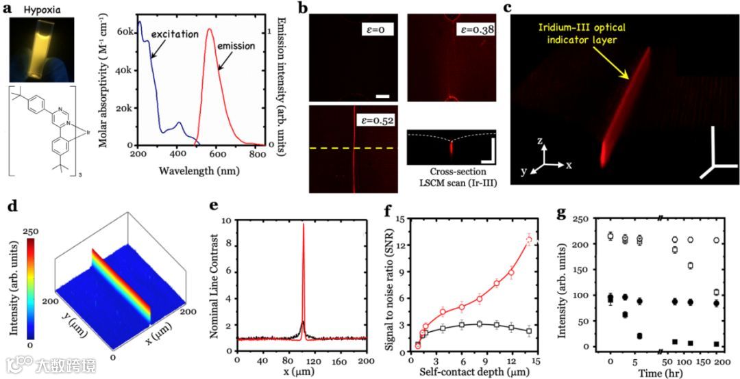 铱-III(Ir-III)配合物是一种富氧猝灭性的磷光发光材料,在缺氧条件下通过光激发,能发出橙红色光(λ发射= 580 nm,图2a)。本研究创造性的利用精准折叠形成空间缺氧效应,Ir-III涂层的光信号强度在特定折叠区域得以最大限度的保留(图2b)。反观其它暴露在空气中的区域,大部分表面荧光信号由于富氧淬灭作用而消逝,从而得到具有超高对比度的拓扑光学信号(请参见图2c中的“刀片”三维形貌,和图2d的强度分析),与图1g形成鲜明对比。本文定义了标称线对比度(NLC),以比较所选区域的光信号对比度。在分析了图2b和1e中选定线的NLC数据(图2e)后,Ir-III涂层的NLC值大大高于FoA涂层表面的NLC值,从而显示出在对比度上的优越性。