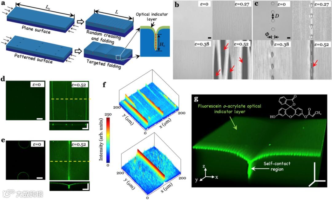 图1a显示了在触发弹性拓扑表面(如折叠、褶皱形貌)的同时,通过构建一层光学指示薄膜(例如邻丙烯酸荧光素(FoA),可以实现可控形变诱导聚集光传感功能。当弹性体受到一维机械力压缩时,表面发生折叠、褶皱时,产生荧光层的物理聚集,从而从顶视图方向上实现图案化。弹性表面褶皱、折叠现象,在光滑表面上是随机分布的(图1b)。这种表面拓扑结构,可以通过预先设置的表面微孔(阵列),诱导产生位置精准可控的图案(图1c)。通过评估三维荧光图案形貌(使用激光扫描共聚焦显微镜LSCM,图1d和1e),诱导图案化的线条图案比随机线条有着更高的亮度。从用于FoA图案表面的LSCM 三维图像(绿色“打开的书本”形状,图1g)中,由于小折痕/褶皱导致的荧光素聚集不连续,背景上的光信号噪点非常明显。