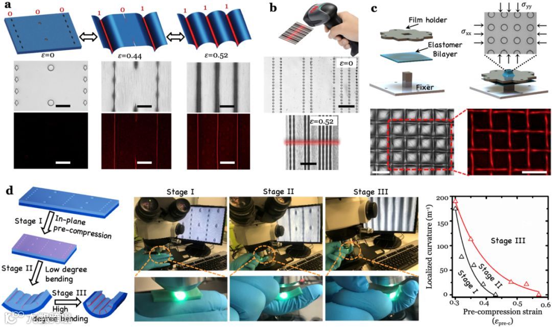 图4 应用展示;(a)双阶平面应变传感器(b)平面应变传感条形码;(c)双轴等应变压缩产生的传感栅格的形成;(d)基于平面应变和局部弧度触发的双关联弯曲传感器,可以侦测关节弯曲行为;所有比例尺均为100微米。