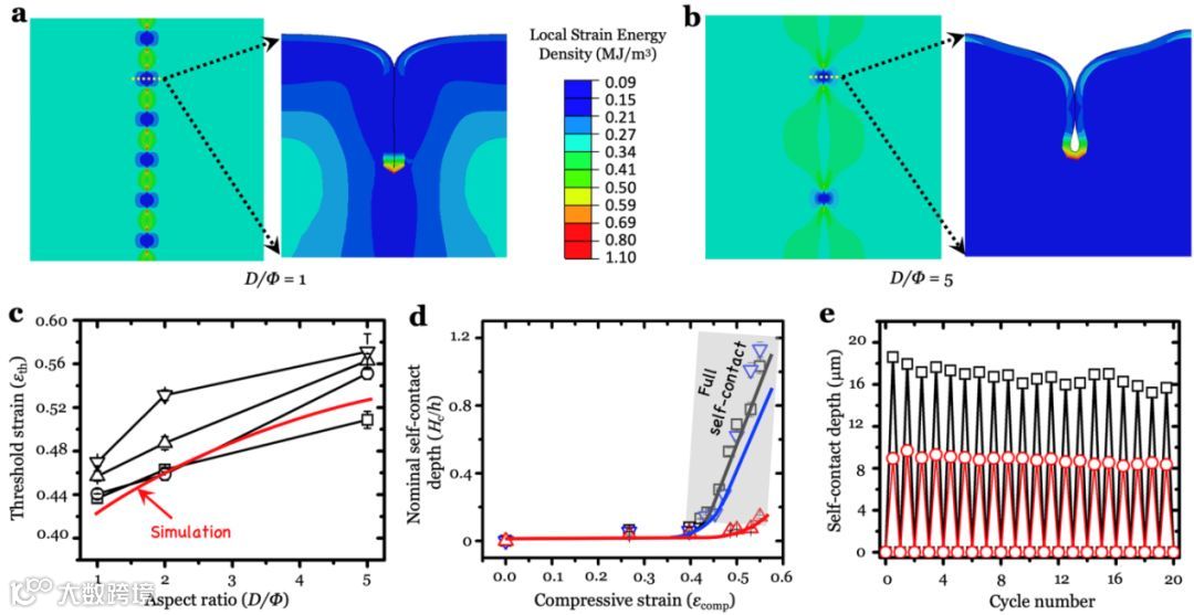 图3 表面诱导精准折叠的力学行为分析和可重复性评估;在(a)低孔间距/孔径比和(b)高孔间距/孔径比的情况下,对具有单个微孔阵列(孔直径= 40微米)的表面进行面内和面外应变能分析;(c)对带有孔阵列的表面在不同孔间距/孔径比下的模拟(孔封闭的衬底阈值应变)与实验值的比较;(d)用单个微孔阵列(黑色表示),标定自接触深度(Hc / h)的模拟(直线)和实验(点符号)结果;(e)Hc深度的循环测试结果。