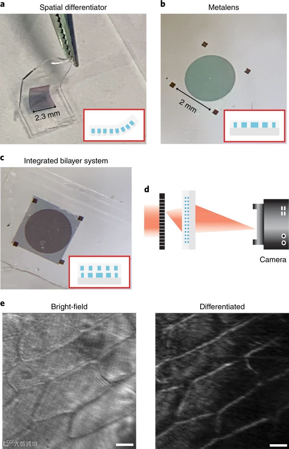 图5、(a-c)纳米光子差分器(a)、超透镜(b)和双层复合系统(c)的光学图像。(d) 成像装置示意图。(e)洋葱细胞的亮场(左)和差分(右)成像结果。