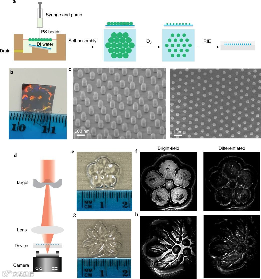图4、(a)使用纳米球光刻技术的大尺寸图像差分器制造工艺流程图。(b) 厘米级差分器的光学图像。(c) 硅棒的扫描电镜图像。(d)成像装置示意图。(e-h) 两种塑料花模型的光学图像(e,g)亮场图像(f,h左)和差分图像(f,h右)。