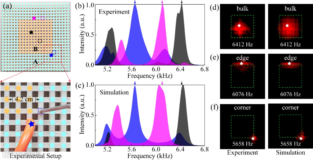图3:实验检测声学四极子拓扑绝缘体的边缘态和角态