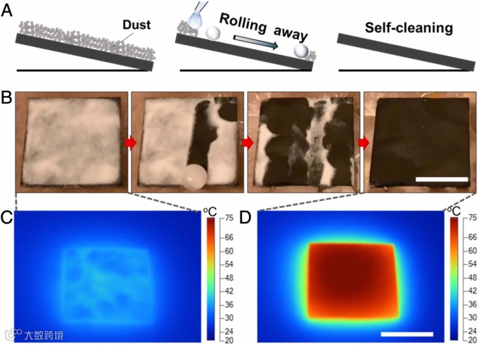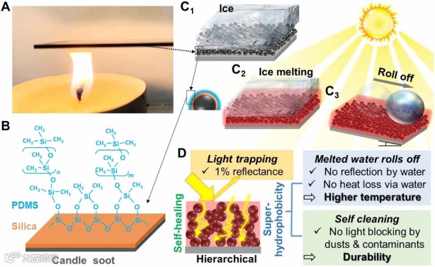 1. 基于廉价的蜡烛烟灰实现了低成本、高效率的超疏水光热表面。