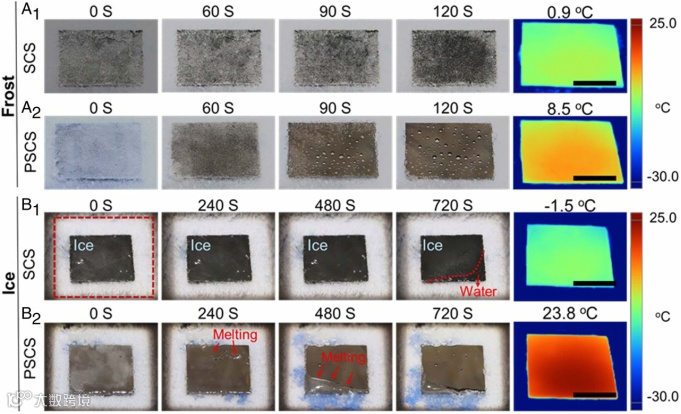 图3. 一个太阳照射下SCS和PSCS表面霜和冰的光热融化。