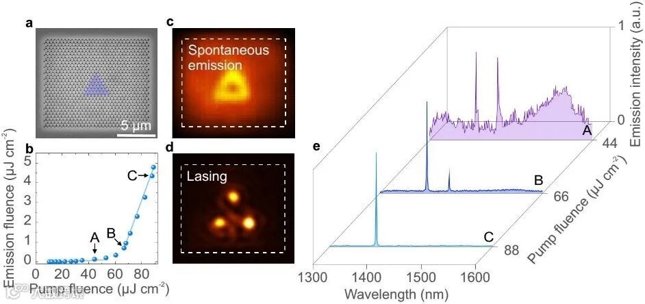 :拓扑腔中的激光。a:样品的扫描电镜图像 b: