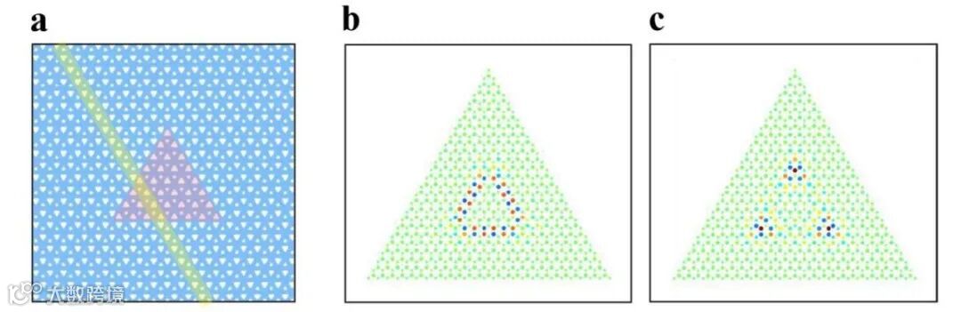 图1:谷霍尔拓扑光子腔。a: 在二聚石墨烯晶格中通过打破宇称对称形成封闭畴壁,形成等边三角形(红色区域)。阴影黄色条纹显示了一个锯齿状切割的超晶胞。b, c: 结构光学模式的紧束缚模型可视化。