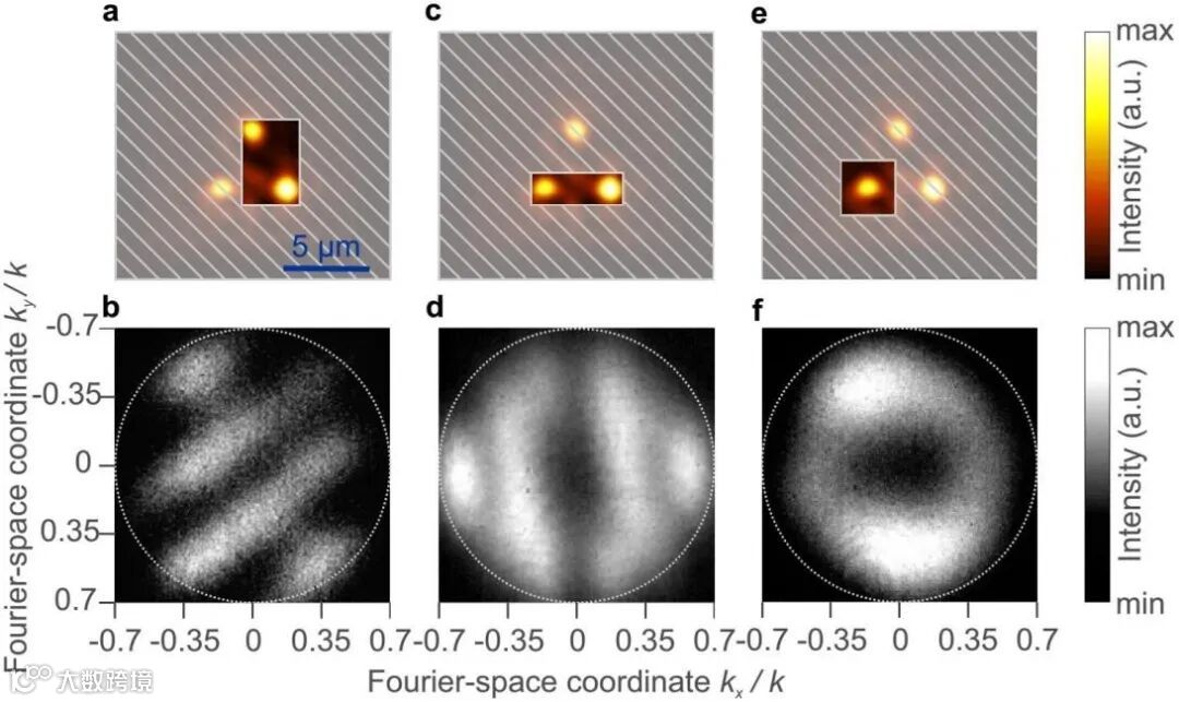 同时,当两个发射点在真实空间中被孤立时[图3 (a,c)],可以观察到傅里叶空间中的干涉图案[图3 (b,d)],这表明发射是相干的。这些结果说明图中的三个模式是彼此耦合的,测量的干涉图像显示出了激光的特征
