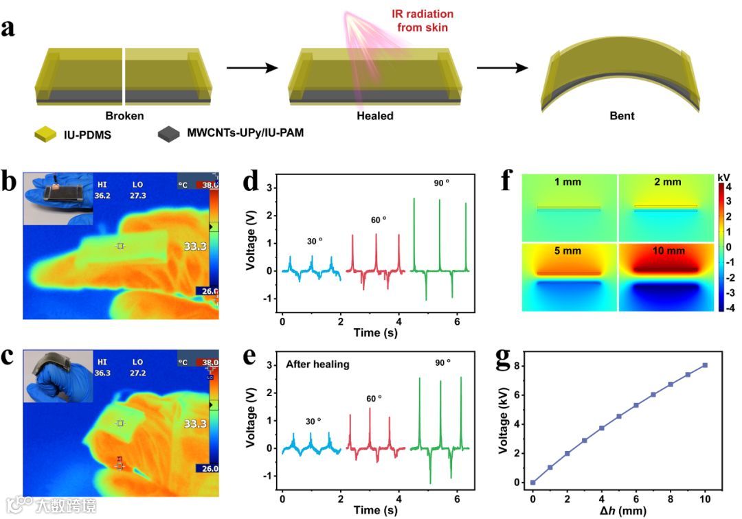 器件作为人体运动自供能传感器以监测指关节弯曲,能够实现30°-90°的弯曲检测。同时,器件在受损后,可利用人体皮肤的红外辐射促进受损器件的自我修复,也可以在NIR作用下实现快速修复。多重修复方式提升了器件使用的可靠性与安全性(图4)。