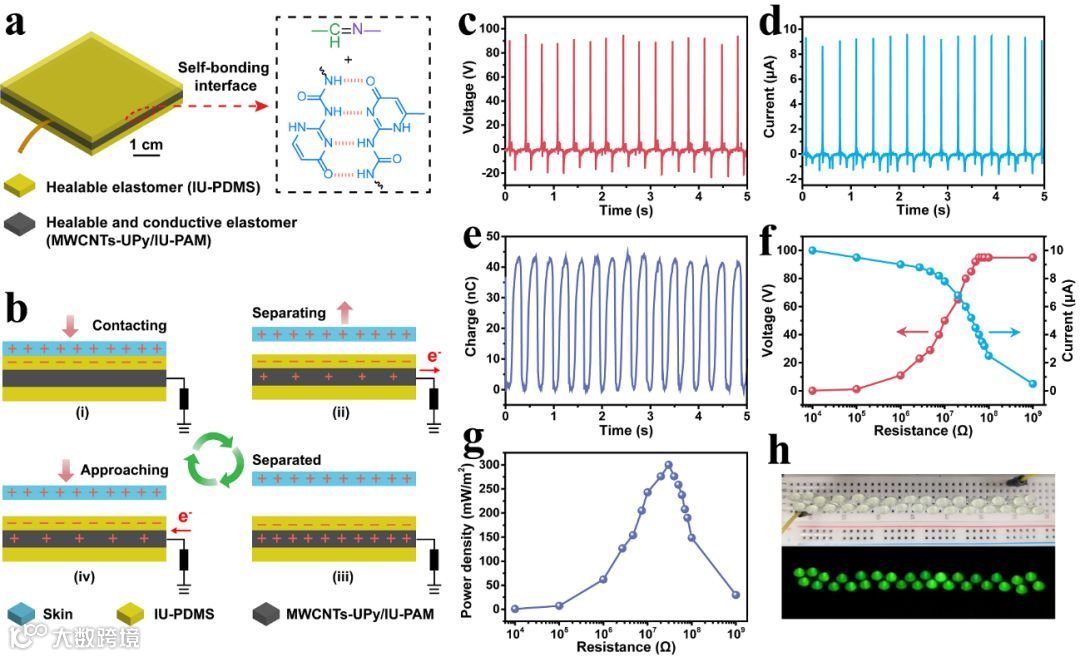 通过摩擦纳米发电机的器件结构设计,将所合成的自修复弹性体IU-PDMS作为摩擦层,MWCNTs-UPy/IU-PAM作为电极层,组装得到单电极模式的自修复摩擦纳米发电机(IU-TENG)。由于各层结构中都含有相同的动态单元(亚胺键与四重氢键),从而仅通过简单重叠的方式,各层结构间便具有了良好的界面结合力。结果表明,器件能有效将机械能转化为电能,并在外接负载30 MΩ时,达到最大输出功率密度(300 mW/m2)。器件的开路电压、短路电流和电荷转移量分别达到95 V,9.5 μA和43nC,并能有效驱动30个以上LED发光(图2)。此外,基于IU-TENG优异的自修复性与柔性,器件可被裁剪为任意形状,经重新拼接修复后器件的输出性能可以恢复如初(图3)。